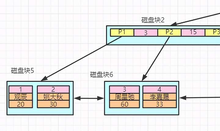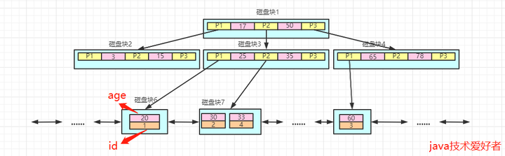 比如要查询age=33的数据,那么首先查到磁盘块7的age=33的数据,获取到主键值,主键值为4。