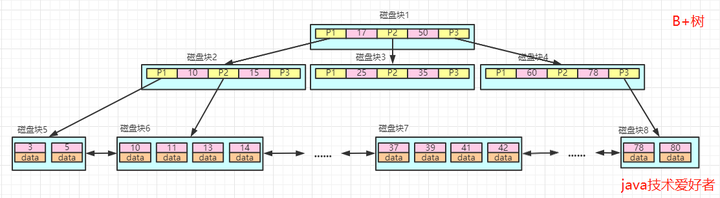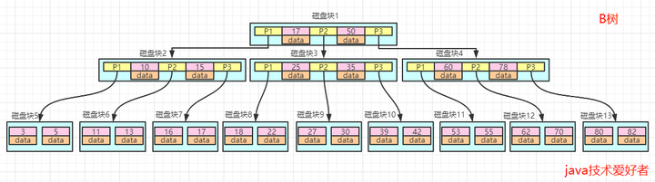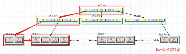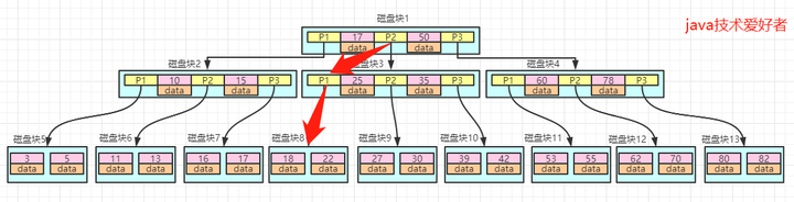 在上面的B树中,假如我们要找值等于18的数据,查找路径就是磁盘块1->磁盘块3->磁盘块8。