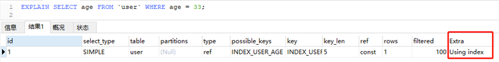 比如上面的例子,我们通过age=33查询,我需要查询的结果就只要age这一列,那就可以用到覆盖索引,如图所示:
