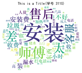 # 代码12-8 查看情感分析效果 # 给情感值大于0的赋予评论类型(content_type)为pos,小于0的为neg emotional_value['a_type'] = '' emotional_value['a_type'][emotional_value['amend_weight'] > 0] = 'pos' emotional_value['a_type'][emotional_value['amend_weight'] < 0] = 'neg' # 查看情感分析结果 result = emotional_value.merge(word, left_on = 'index_content', right_on = 'index_content', how = 'left') result = result[['index_content','content_type', 'a_type']].drop_duplicates() confusion_matrix = pd.crosstab(result['content_type'], result['a_type'], margins=True) # 制作交叉表 (confusion_matrix.iat[0,0] + confusion_matrix.iat[1,1])/confusion_matrix.iat[2,2] # 提取正负面评论信息 ind_pos = list(emotional_value[emotional_value['a_type'] == 'pos']['index_content']) ind_neg = list(emotional_value[emotional_value['a_type'] == 'neg']['index_content']) posdata = word[[i in ind_pos for i in word['index_content']]] negdata = word[[i in ind_neg for i in word['index_content']]] # 绘制词云 import matplotlib.pyplot as plt from wordcloud import WordCloud # 正面情感词词云 freq_pos = posdata.groupby(by = ['word'])['word'].count() freq_pos = freq_pos.sort_values(ascending = False) backgroud_Image=plt.imread("D:\\360MoveData\\Users\\86130\\Documents\\Tencent Files\\2268756693\\FileRecv\\pl.jpg") wordcloud = WordCloud(font_path="C:\\Windows\\Fonts\\STZHONGS.ttf", max_words=100, background_color='white', mask=backgroud_Image) pos_wordcloud = wordcloud.fit_words(freq_pos) plt.imshow(pos_wordcloud) plt.rcParams['font.sans-serif'] = ['SimHei'] # 添加这条可以让图形显示中文 plt.title('This is a Title(学号 3110)') plt.axis('off') plt.show() # 负面情感词词云 freq_neg = negdata.groupby(by = ['word'])['word'].count() freq_neg = freq_neg.sort_values(ascending = False) neg_wordcloud = wordcloud.fit_words(freq_neg) plt.imshow(neg_wordcloud) plt.rcParams['font.sans-serif'] = ['SimHei'] # 添加这条可以让图形显示中文 plt.title('This is a Title(学号 3110)') plt.axis('off') plt.show() # 将结果写出,每条评论作为一行 posdata.to_csv("D:\\360MoveData\\Users\\86130\\Documents\\Tencent Files\\2268756693\\FileRecv\\posdata.csv", index = False, encoding = 'utf-8') negdata.to_csv("D:\\360MoveData\\Users\\86130\\Documents\\Tencent Files\\2268756693\\FileRecv\\negdata.csv", index = False, encoding = 'utf-8')