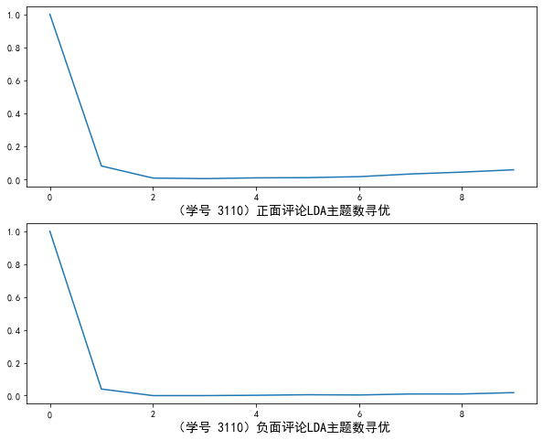 # 代码12-10 主题数寻优 # 构造主题数寻优函数 def cos(vector1, vector2): # 余弦相似度函数 dot_product = 0.0; normA = 0.0; normB = 0.0; for a,b in zip(vector1, vector2): dot_product += a*b normA += a**2 normB += b**2 if normA == 0.0 or normB==0.0: return(None) else: return(dot_product / ((normA*normB)**0.5)) # 主题数寻优 def lda_k(x_corpus, x_dict): # 初始化平均余弦相似度 mean_similarity = [] mean_similarity.append(1) # 循环生成主题并计算主题间相似度 for i in np.arange(2,11): lda = models.LdaModel(x_corpus, num_topics = i, id2word = x_dict) # LDA模型训练 for j in np.arange(i): term = lda.show_topics(num_words = 50) # 提取各主题词 top_word = [] for k in np.arange(i): top_word.append([''.join(re.findall('"(.*)"',i)) \ for i in term[k][1].split('+')]) # 列出所有词 # 构造词频向量 word = sum(top_word,[]) # 列出所有的词 unique_word = set(word) # 去除重复的词 # 构造主题词列表,行表示主题号,列表示各主题词 mat = [] for j in np.arange(i): top_w = top_word[j] mat.append(tuple([top_w.count(k) for k in unique_word])) p = list(itertools.permutations(list(np.arange(i)),2)) l = len(p) top_similarity = [0] for w in np.arange(l): vector1 = mat[p[w][0]] vector2 = mat[p[w][1]] top_similarity.append(cos(vector1, vector2)) # 计算平均余弦相似度 mean_similarity.append(sum(top_similarity)/l) return(mean_similarity) # 计算主题平均余弦相似度 pos_k = lda_k(pos_corpus, pos_dict) neg_k = lda_k(neg_corpus, neg_dict) # 绘制主题平均余弦相似度图形 from matplotlib.font_manager import FontProperties font = FontProperties(size=14) #解决中文显示问题 plt.rcParams['font.sans-serif']=['SimHei'] plt.rcParams['axes.unicode_minus'] = False fig = plt.figure(figsize=(10,8)) ax1 = fig.add_subplot(211) ax1.plot(pos_k) ax1.set_xlabel('(学号 3110)正面评论LDA主题数寻优', fontproperties=font) ax2 = fig.add_subplot(212) ax2.plot(neg_k) ax2.set_xlabel('(学号 3110)负面评论LDA主题数寻优', fontproperties=font)