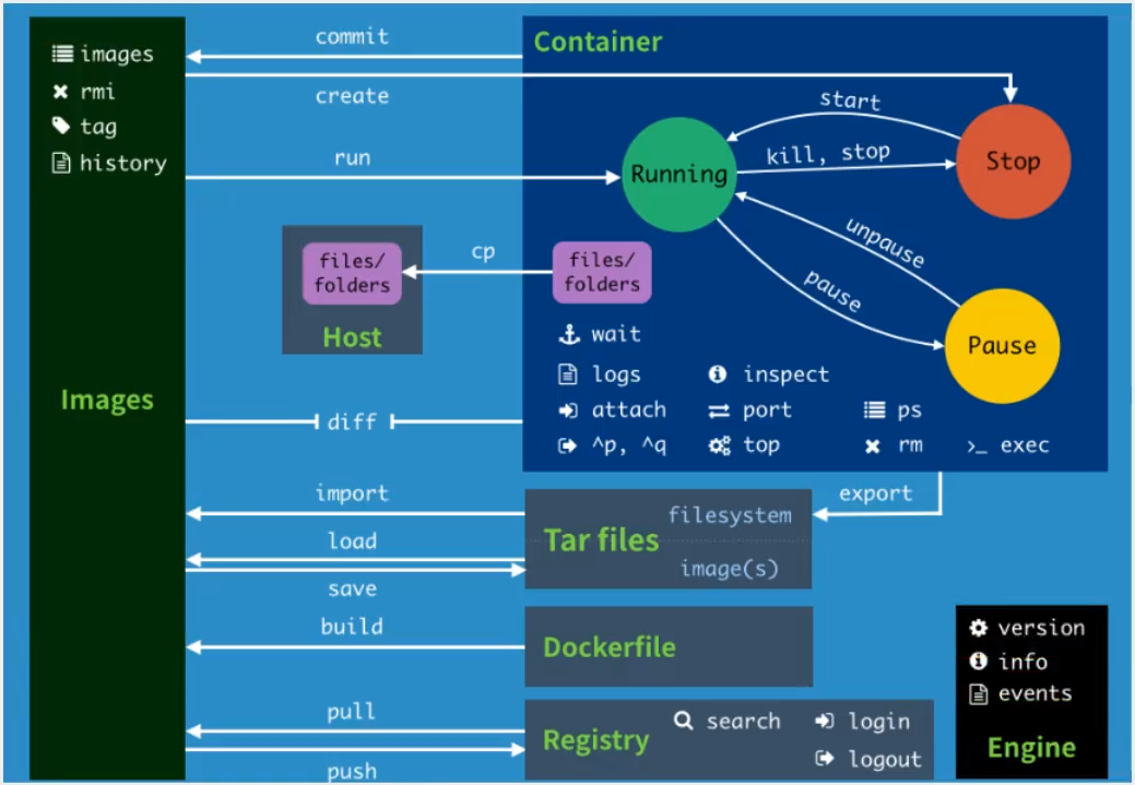下图中是常见的docker指令,用于操作容器和镜像,熟悉这些指令后即可完成基本的程序打包与部署