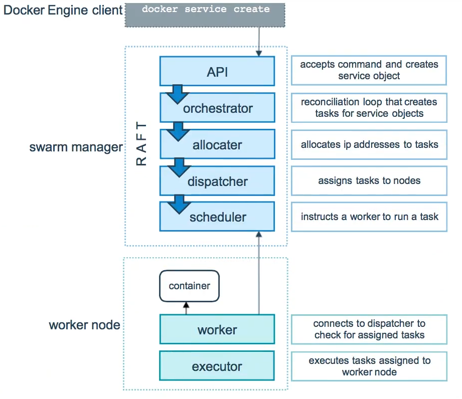 命令 -> 管理节点 -> api -> 调度 -> 工作节点(根据Task创建维护容器)