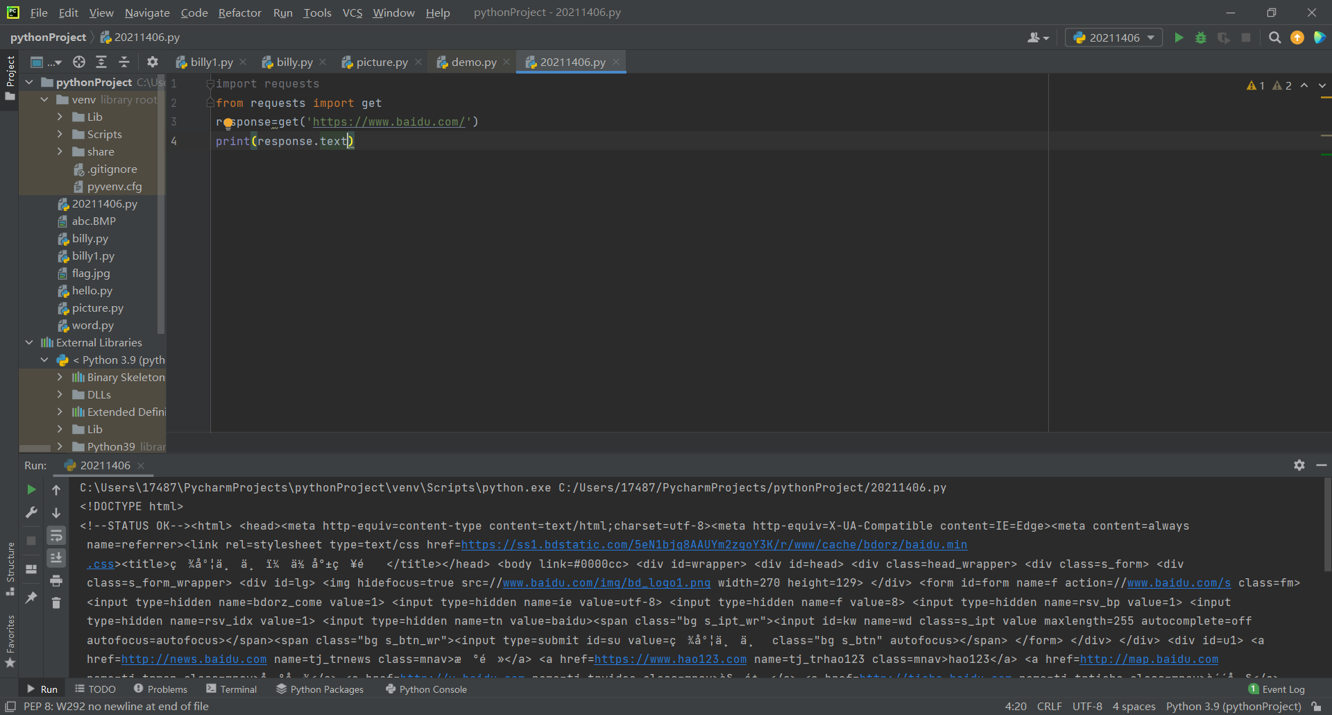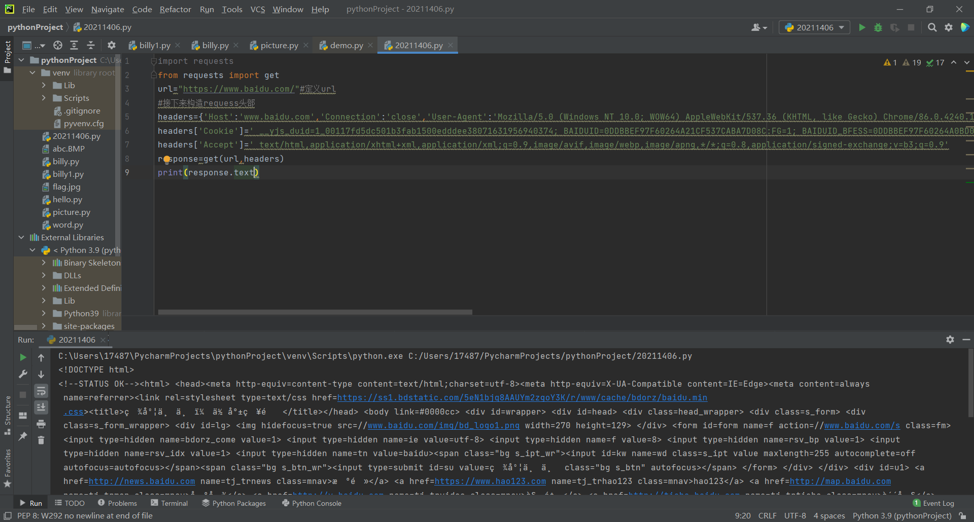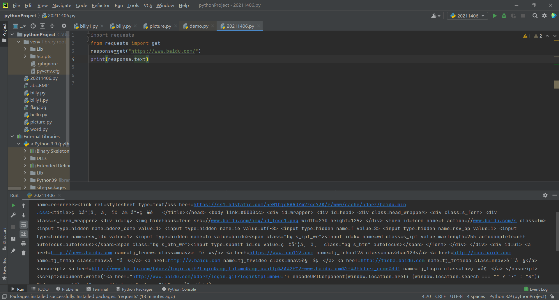 如图我们对www.baidu.com请求访问,得到的response是200,也就是说服务器,客户端和网站信息一切正常,接下来我们使用response.content查看页面全部html代码