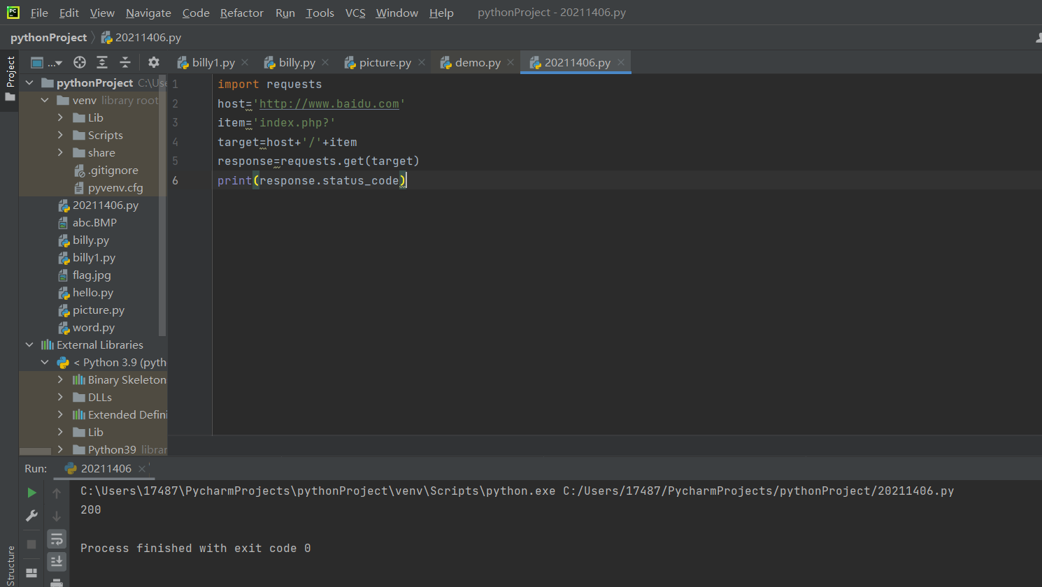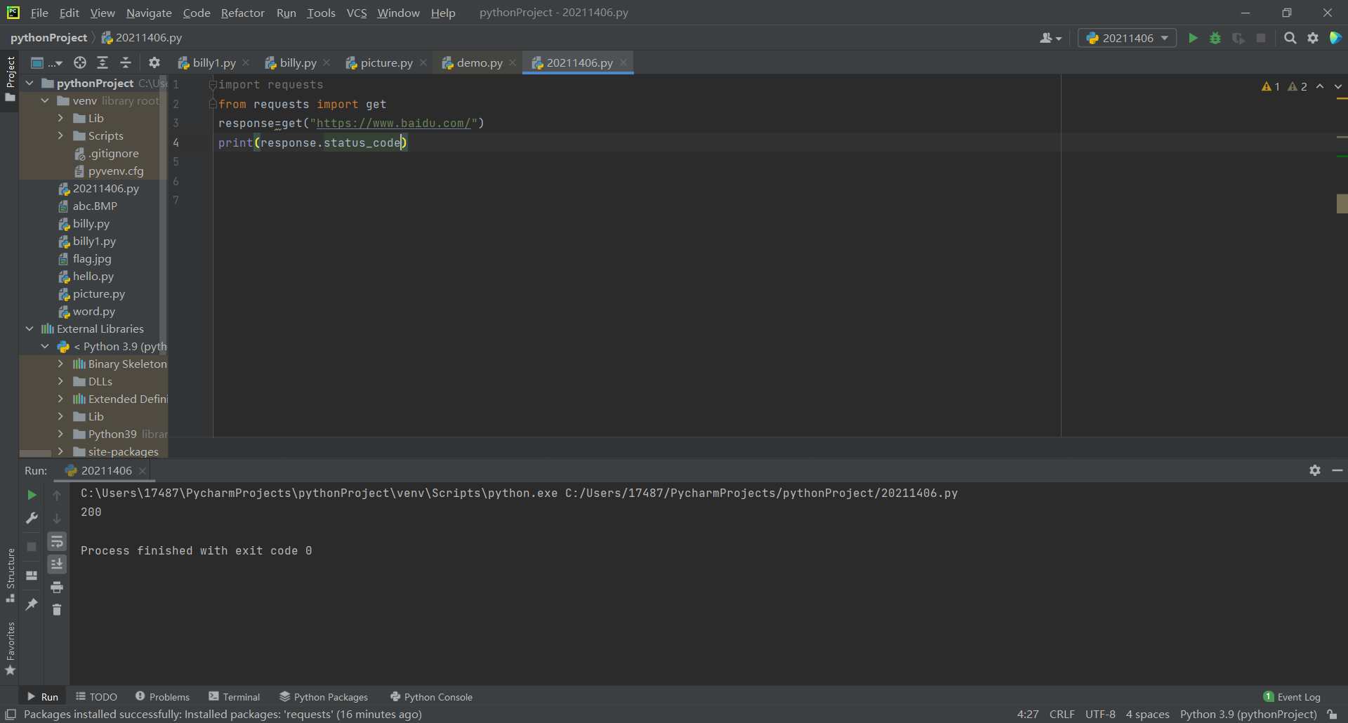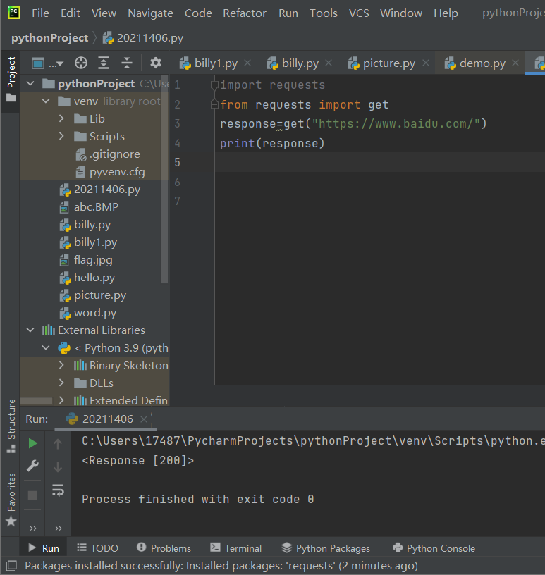 如图我们对www.baidu.com请求访问,得到的response是200,也就是说服务器,客户端和网站信息一切正常,接下来我们使用response.content查看页面全部html代码