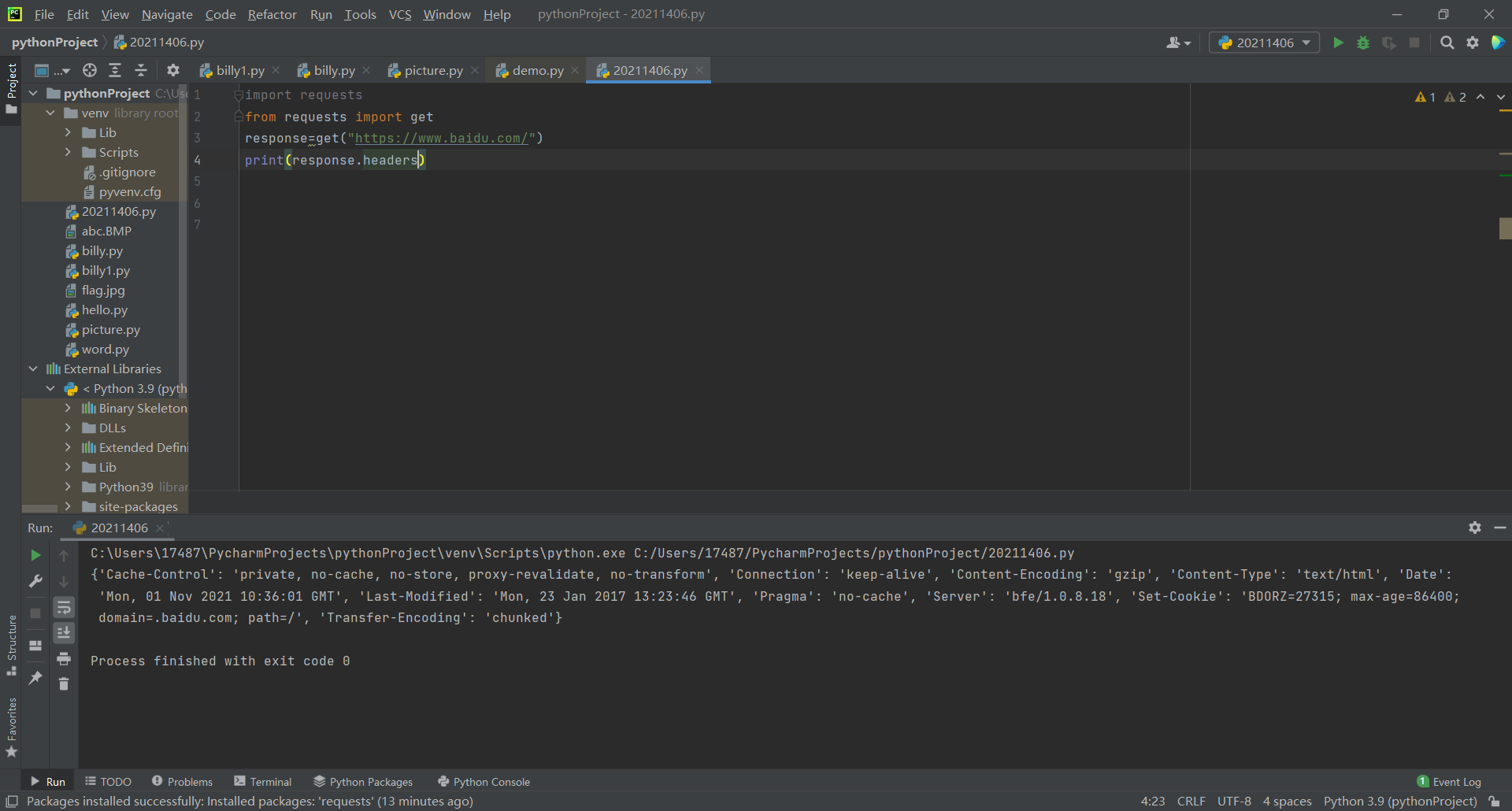 如上图我们可以查看www.baidu.com的消息头,当然我们也可以运用pycharm构造hearder