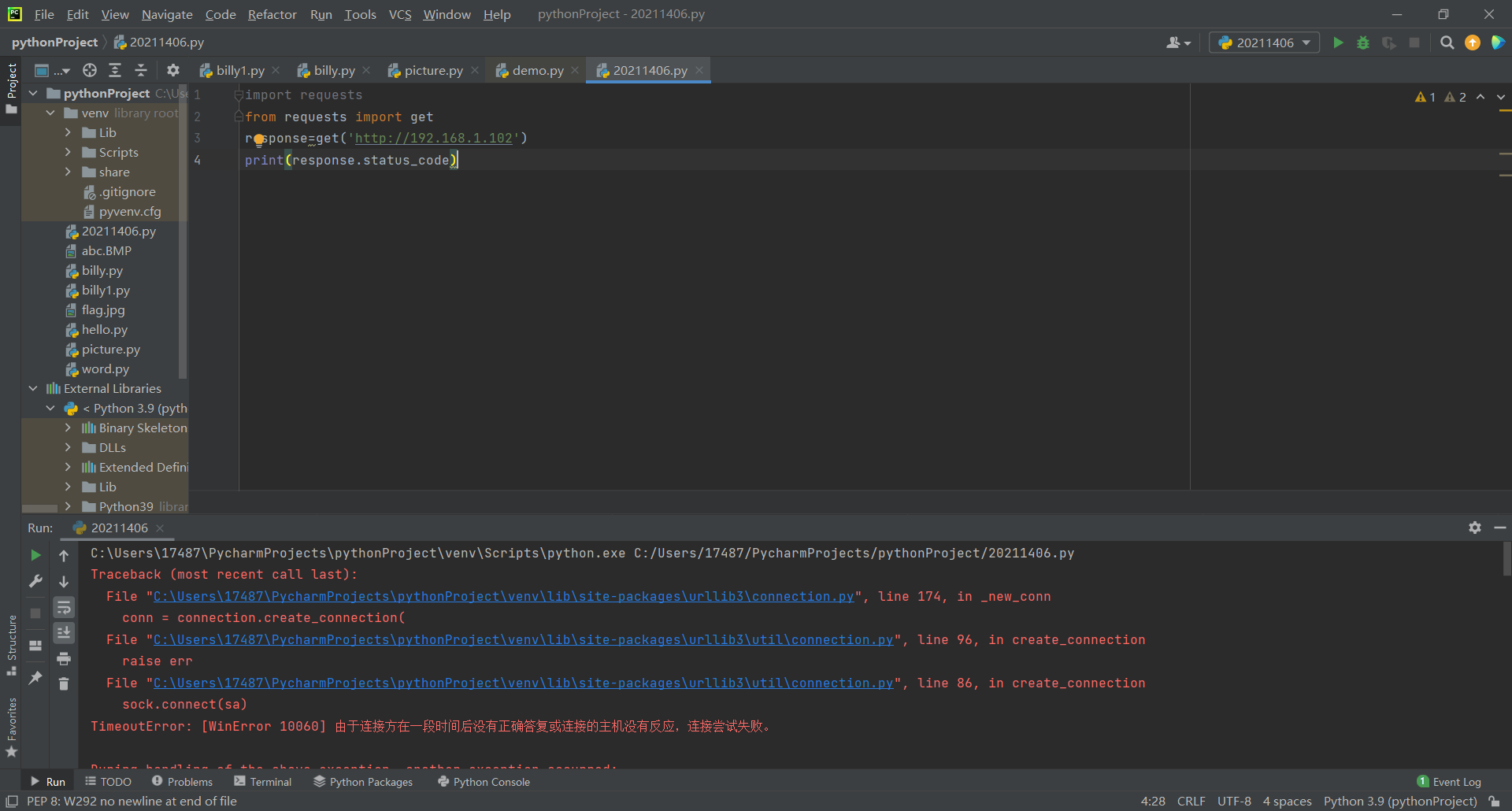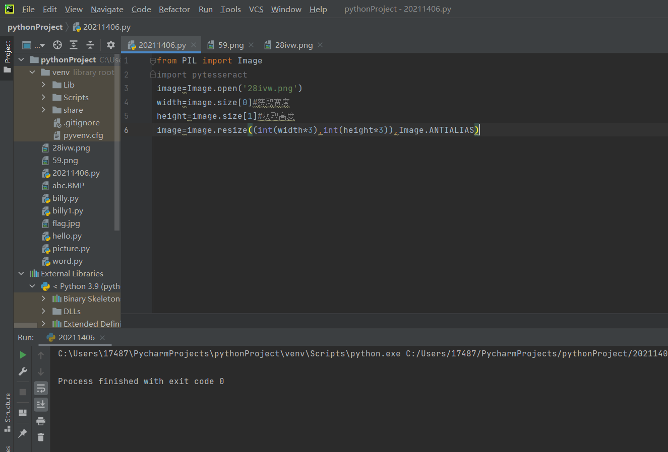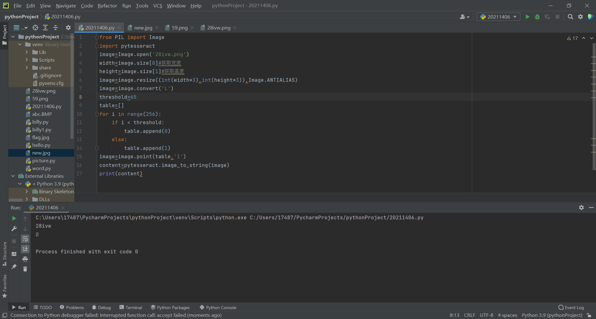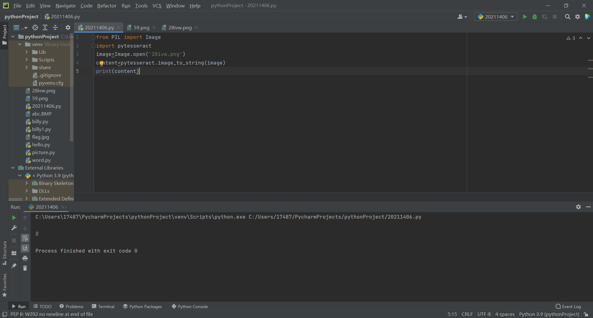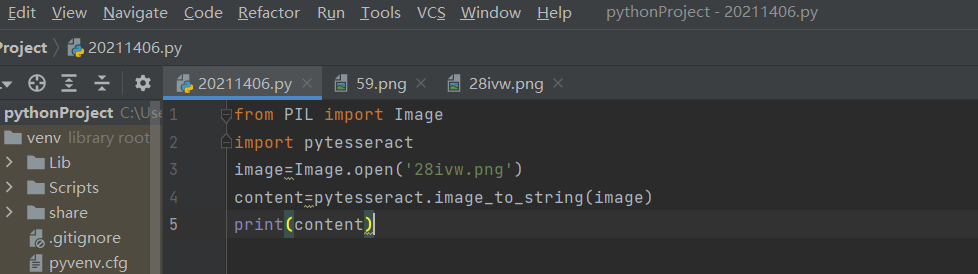 4.在pycharm中下载pytesseract模组,再将我们验证码图片运行在pycharm中