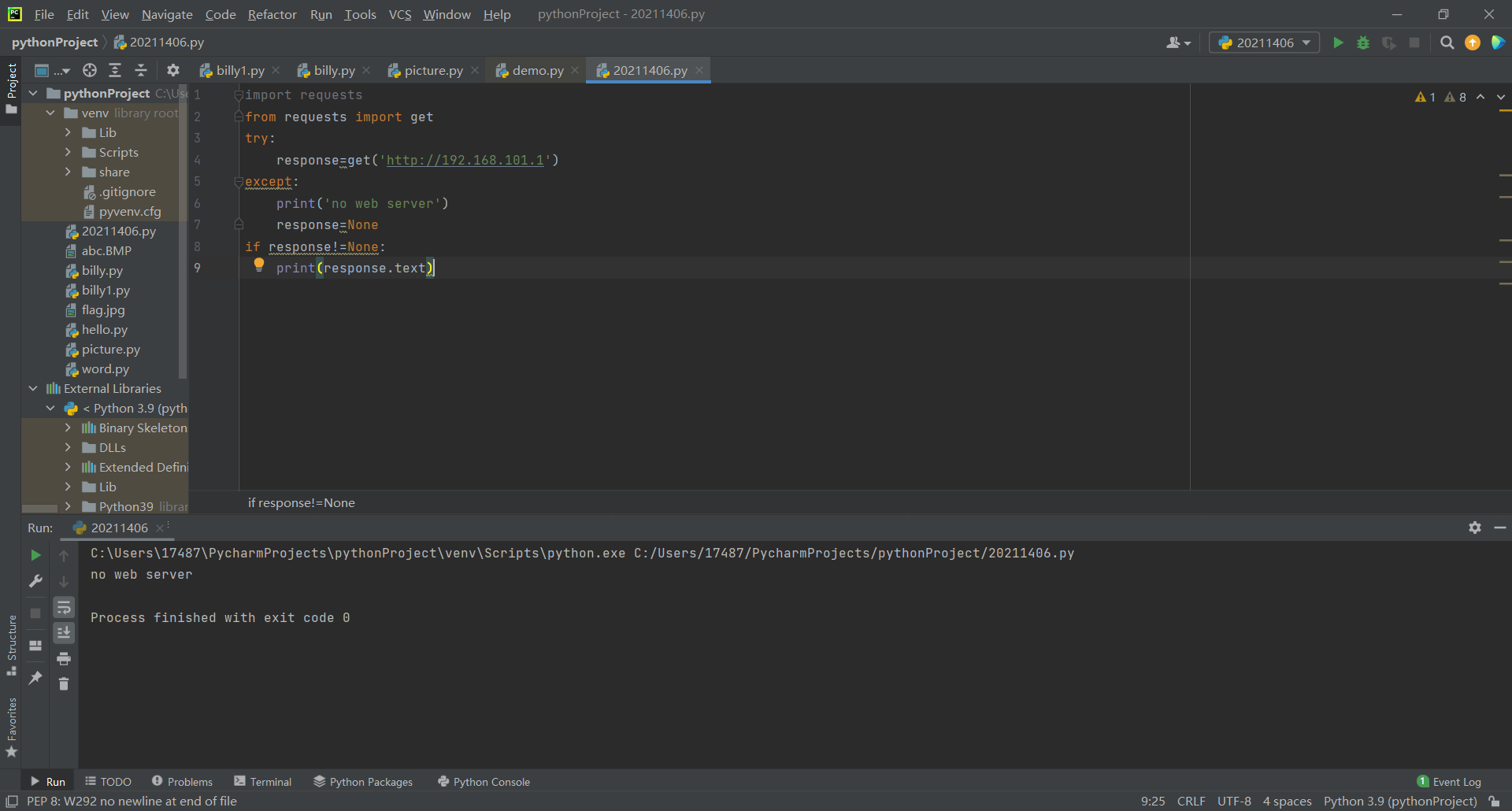 Web渗透是个很复杂的工作,它的应用在近年来也是极为热门的研究方向,本章节提出了HTTP的概念和methods,以及网站状态代码,pycharm中requests的使用,最后给出了识别验证码思路