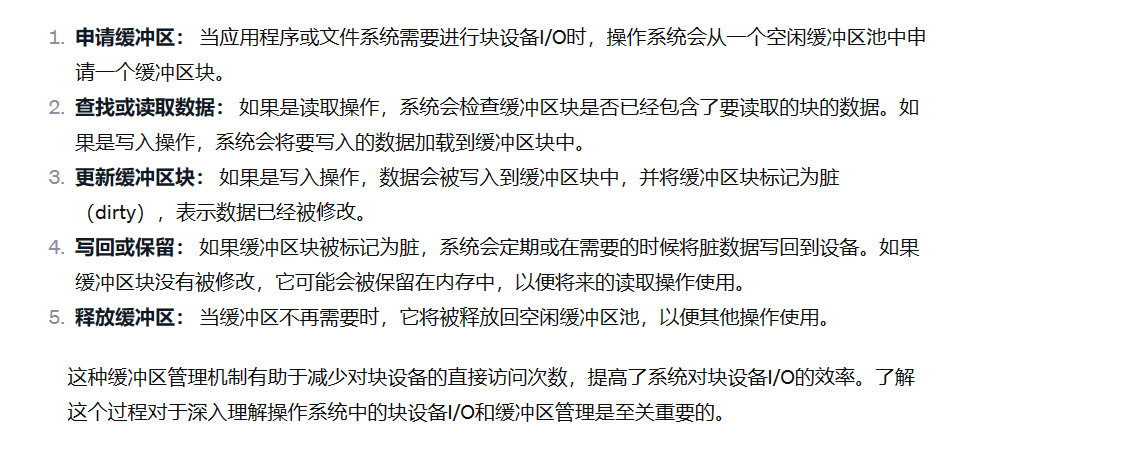 写入操作: 当进程写入磁盘块时,系统首先获取一个分配给该块的缓冲区,将数据写入缓冲区,将缓冲区标记为脏(表示数据已被修改),然后释放到缓冲区缓存中。脏缓冲区只有在被重新分配到不同的块时才会写入磁盘。