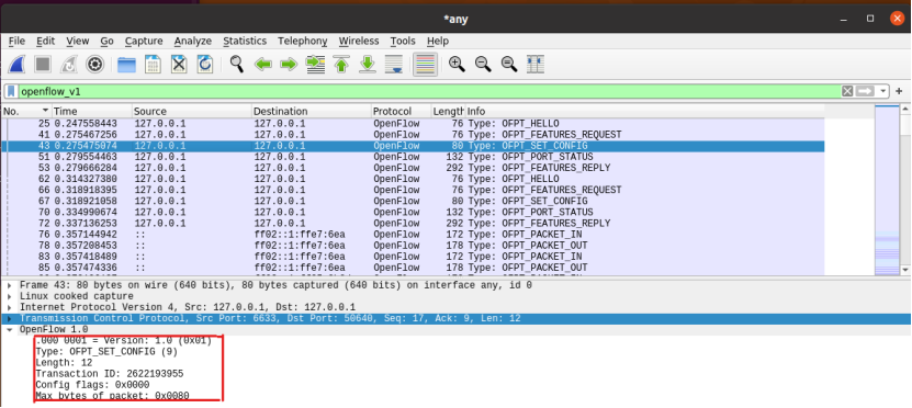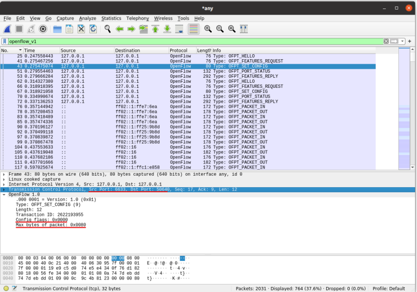 max bytes of packet:当交换机无法处理到达的数据包时,向控制器发送如何处理的最大字节数,本实验中控制器发送的值是0x0080,即128字节