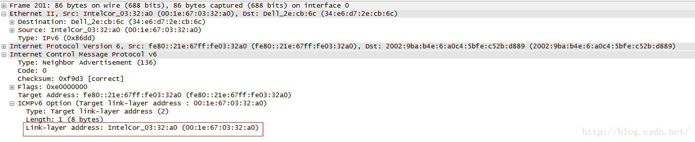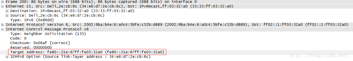 下图两图分别为NS与NA的抓包数据。NS中的红框框起来的target address,就是要查询的地址,当对端回应NA的时候,会在link-layer address填充自己的mac地址。当发送NS的主机接收到NA后。就能够完毕MAC地址到ipv6地址的映射