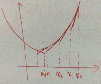 初始点为x0。 然后往梯度的反方向移动一小步r到x1。 再次往梯度反方向移动r到x2,... ...。终于会越来越接近极值点min的。