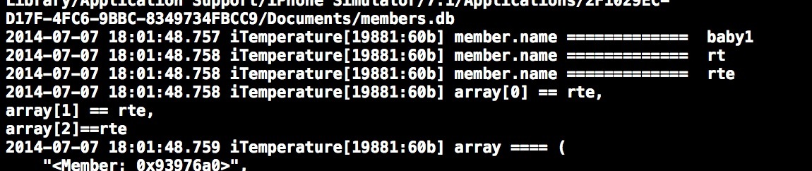 member.name = [rs stringForColumn:@"Name"]; member.age = [rs intForColumn:@"Age"]; member.sex = [rs intForColumn:@"Sex"]; member.height = [rs intForColumn:@"Height"]; member.Weight = [rs intForColumn:@"Weight"]; member.icon = [UIImage imageWithData:[rs dataForColumn:@"Photo"]]; NSLog(@"member.name ============= %@",member.name); [array addObject:member];</span> } [membersDB close];<span style="color:#FF0000;"> NSLog(@"array[0] == %@,\narray[1] == %@,\narray[2]==%@",[array[0] name],[array[1] name],[array[2] name]);</span> return [array copy]; }