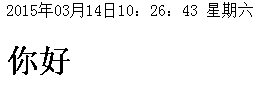 <!-- 改好网页头的编码为utf-8,引入对应的java包 --> <%@ tag language="java" pageEncoding="utf-8" import="java.util.Date,java.text.SimpleDateFormat"%> <!-- 这个本标签将会引入id參数 --> <%@ attribute name="id" %> <% //假设要在jsp脚本中使用传入參数则这样写 request.getAttribute("a"); //输出时间 out.println(new SimpleDateFormat("yyyy年MM月dd日hh:mm:ss E").format(new Date(System.currentTimeMillis())).toString()); %> <!-- 假设这个參数是直接输出的,则这样写 --> <h1>${id}</h1>4、在index.jsp对tags:clock标签传入參数“你好”。就会看到执行效果了。这样就形成了所谓的MODEL2网页编程规则,就是正常网页中不得出现不论什么的执行代码……说什么可以非常好地提高网页代码的复用性。