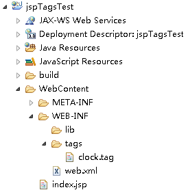 站点目录结构例如以下图,在WEB-INF下新建一个tags目录,之后我们的标签都是tags:了,这个目录的命名决定了以后的标签头,这个目录以后就是我们的标签库。理论上这个tags放在哪里都能够,可是。为了不让别实用心的用户胡乱訪问,所以还是放在WEB-INF之中: