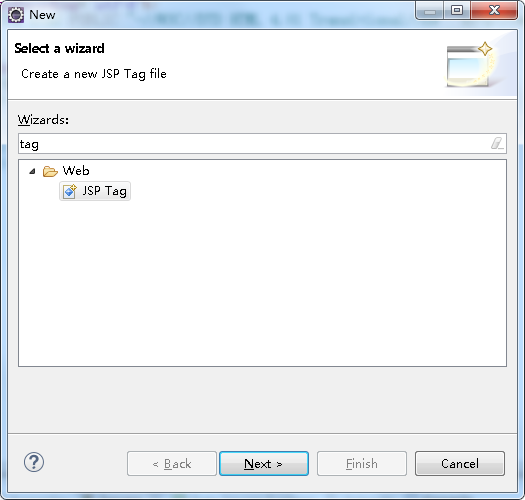 2、在弹出的对话框。输入tags,选择JSP Tag,点击下一步,命名为clock,因为clock.tag在tags里面,以后调用这个标签就tags:clock了。你的目录与文件名称的名字决定了这个以后标签的名字,就能够開始编辑clock.tag了