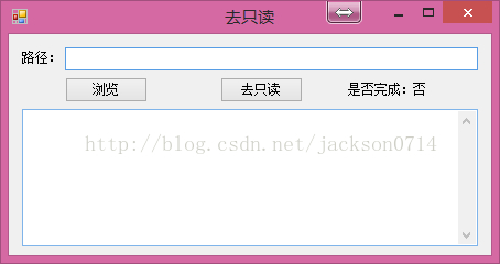 using System; using System.Collections.Generic; using System.ComponentModel; using System.Data; using System.Drawing; using System.Linq; using System.Text; using System.Windows.Forms; using System.IO; using Mysoft.Common.Multithread; namespace 除去仅仅读 { public partial class Form1 : Form { public delegate void MyDelegate(string fileName); private string _errorMessage = ""; public void DelegateMethod(string fp) { textBox2.Text = fp + "\r\n" + textBox2.Text; textBox2.SelectionStart = textBox2.Text.Length; textBox2.ScrollToCaret(); } public Form1() { InitializeComponent(); } private void openFileDialog1_FileOk(object sender, CancelEventArgs e) { } //函数名:button2_Click //函数功能:选择文件路径 //输入參数:object sender, EventArgs e //输出參数:无 private void button2_Click(object sender, EventArgs e)//选择文件路径 { FolderBrowserDialog fbd = new FolderBrowserDialog(); fbd.ShowDialog(); string folderName = fbd.SelectedPath; //获得选择的目录路径 textBox1.Text = folderName; } private void button1_Click(object sender, EventArgs e) { try { string dirPath = textBox1.Text; if (dirPath != "") { textBox2.Text = ""; List<string> pathList = new List<string>(); string[] dirPathes = Directory.GetDirectories(dirPath, "*.*", SearchOption.TopDirectoryOnly); foreach (var dp in dirPathes) { if (!Directory.Exists(dp)) { continue; } pathList.Add(dp); } ThreadPool<string> thread = new ThreadPool<string>(pathList); thread.MaxThreadCount = 6; thread.OnProcessData += new ThreadPool<string>.ProcessDataDelegate(SetReadOnly); thread.Start(false); LableMessage.Text = "是"; LableMessage.ForeColor = Color.Red; } } catch (Exception ex) { MessageBox.Show("文件路径存在问题,请又一次选择路径"); } } private void SetReadOnly(string dirPath) { try { string[] dirPathes = Directory.GetDirectories(dirPath, "*.*", SearchOption.AllDirectories); foreach (var dp in dirPathes) { if (!Directory.Exists(dp)) { continue; } if (dp.Substring(dp.ToString().Length - 3, 3).ToUpper() == "bin".ToUpper() || dp.Substring(dp.ToString().Length - 3, 3).ToUpper() == "obj".ToUpper()) { DirectoryInfo dir = new DirectoryInfo(dp); dir.Attributes = FileAttributes.Normal & FileAttributes.Directory; string[] filePathes = Directory.GetFiles(dp, "*.*", SearchOption.AllDirectories); foreach (var fp in filePathes) { File.SetAttributes(fp, System.IO.FileAttributes.Normal); object[] myArray = new object[1]; myArray[0] = fp; BeginInvoke(new MyDelegate(DelegateMethod), myArray); } } } } catch (Exception ex) { _errorMessage = ex.Message; } finally { } } private void textBox2_TextChanged(object sender, EventArgs e) { } private void LableMessage_Click(object sender, EventArgs e) { } private void textBox1_TextChanged(object sender, EventArgs e) { LableMessage.Text = "否"; LableMessage.ForeColor = Color.Black; } } }using System; using System.Collections.Generic; using System.Linq; using System.Text; namespace Mysoft.Common.Multithread { /// <summary> /// 后台运行接口 /// </summary> public interface IBackgroundExecute { /// <summary> /// 当运行失败时,获取详细的错误信息 /// </summary> string ErrorMessage { get; } /// <summary> /// 更新步骤事件 /// </summary> event UpdateStepDelegate OnUpdateStep; /// <summary> ///更新步骤内进度条事件 /// </summary> event PerformStepDelegate OnPerformStep; /// <summary> /// 运行服务 /// </summary> /// <returns>运行成果返回true。否则返回false</returns> bool Exec(); } /// <summary> /// 更新运行步骤事件參数 /// </summary> public class UpdateStepEventArg : EventArgs { public string StepInfo; public int StepMaxCount; } /// <summary> /// 步骤递增事件參数 /// </summary> public class PerformStepEventArg : EventArgs { public int StepCount = 1; public static PerformStepEventArg SingleStepArg = new PerformStepEventArg(); } /// <summary> /// 更新步骤托付 /// </summary> /// <param name="sender">The sender.</param> /// <param name="e">The e.</param> public delegate void UpdateStepDelegate(object sender, UpdateStepEventArg e); /// <summary> /// 递增步骤托付 /// </summary> /// <param name="sender">The sender.</param> /// <param name="e">The e.</param> public delegate void PerformStepDelegate(object sender, PerformStepEventArg e); }using System; using System.Collections.Generic; using System.Linq; using System.Text; namespace Mysoft.Common.Multithread { /// <summary> /// 显示运行进度条的对话框接口 /// </summary> public interface IProgressDlg { /// <summary> /// 获取或设置总步骤数 /// </summary> int StepCount { get; set; } /// <summary> /// 获取或设置是否同意取消 /// </summary> bool AllowCancel { get; set; } /// <summary> /// 递增滚动栏 /// </summary> void PerformStep(); /// <summary> /// 依据指定的进度数来递增滚动栏 /// </summary> /// <param name="stepCount">要递增的进度数</param> void PerformStep(int stepCount); /// <summary> /// 设置显示的信息 /// </summary> /// <param name="info">要显示的信息</param> void NextSetp(int progressCount, string info); IRunObject RunObject { set; } void Show(); void Hide(); } }