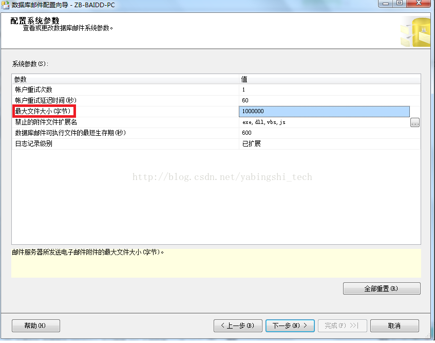配置‘数据库邮件’。将‘最大文件大小(字节)’设置得大些。
