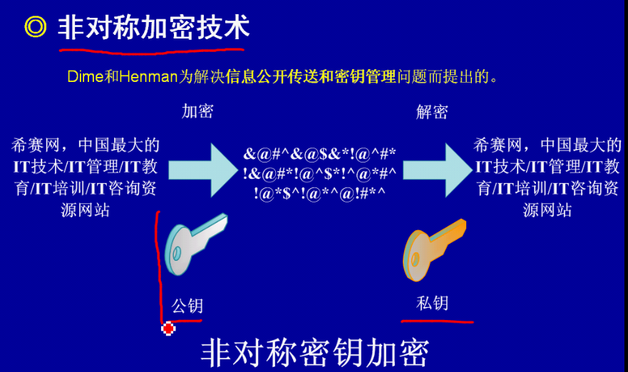 在软考的时候我们学习了加密技术,主要是知识点是公钥签名加密。私钥利用技术手段把重要的数据变为乱码(加密)传送,到达目的地后再用同样或不同的手段还原(解密)。一般在软考的时候考察的是非对称加密技术,他的公钥私钥主要区分好即可了。