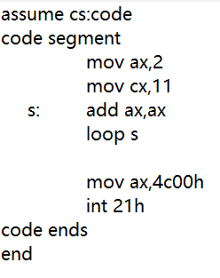 上述代码所实现的是计算2^12,使用11条重复的add ax,ax指令能够达成目标可是太过于繁琐,而使用循环指令loop能够很好的简化程序,下面我们对循环程序进行跟踪。