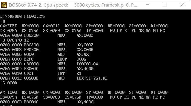 使用u指令查看程序对应的汇编指令以及其在内存的存储情况,并用g指令执行到程序返回之前,在执行之后可以看到结果送入寄存器ax值为1000h即2^12,实现了目标。