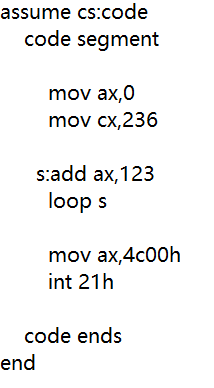 loop在英语中有循环的含义,所以这个指令应该和循环有关。loop指令的格式:loop 标号,这里的标号指明了循环开始的地方。CPU执行loop指令的时候,要进行两步操作:(1)(cx)=(cx)-1(2)判断cx中的值,如果不为零则转至标号处执行程序,如果为零则向下执行。经过书上所给示例的实践,可以总结出用cx和loop指令相配合实现循环功能的3个要点:(1)在cx中存放循环次数(2)loop指令中的标号所标识的地址要在前面(3)要循环执行的程序段,要写在标号和loop指令的中间。
