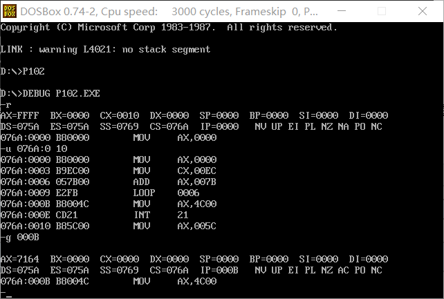 执行和(1)相同的操作可以看到寄存器ax在程序执行到返回前后的值为7164h即29028,实现了目标。在这个实验中如果我们将236加123次,可以用123次加法实现相同的目标,提高了计算的速度。