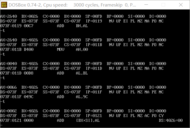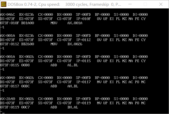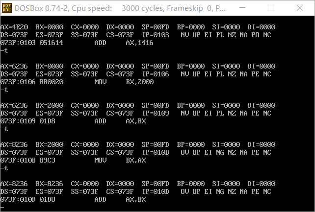 Part 2:运用A命令将指令写入内存,并用T命令使之单步执行。