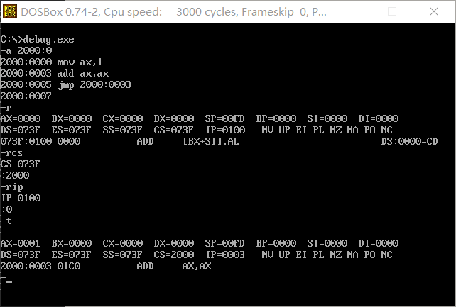(2)将下面3条指令写入从2000:0开始的内存单元中,利用这3条指令计算2的8次方。