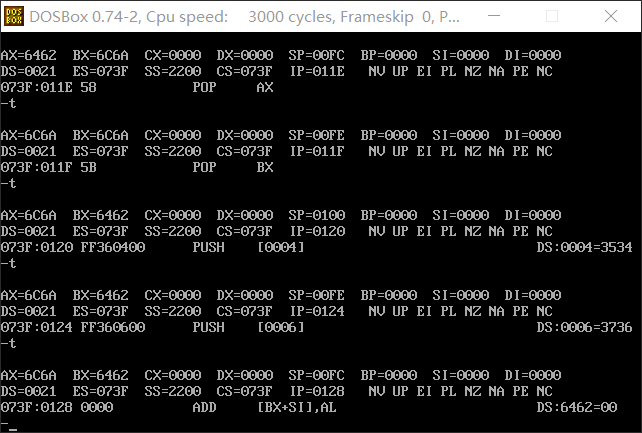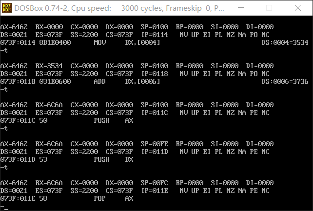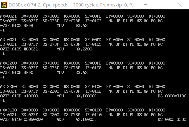分析:此实验使用栈实现了寄存器值的交换,语句mov ss,ax和语句mov sp,0100在使用t命令单步执行时,同时进行。