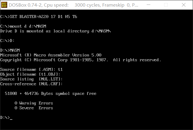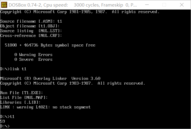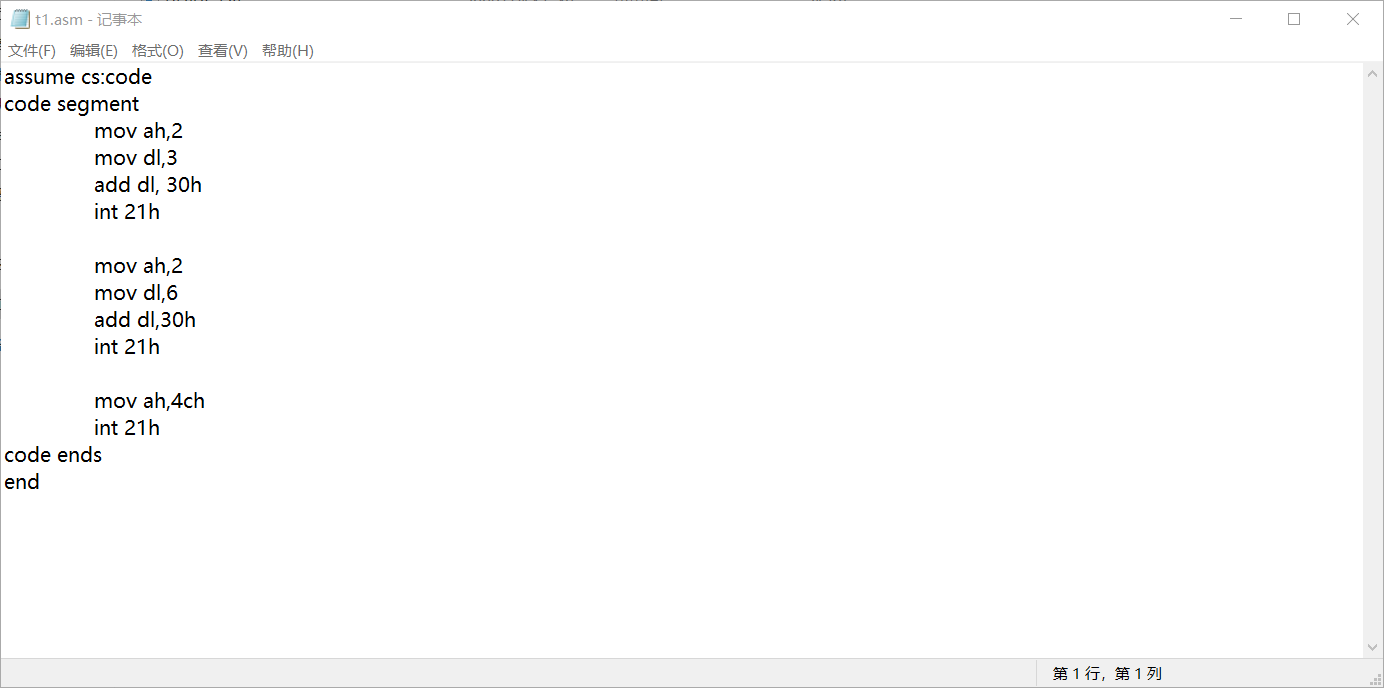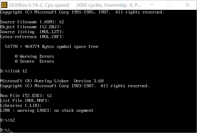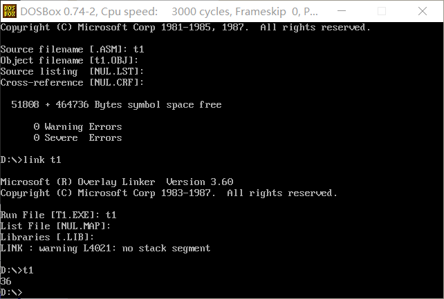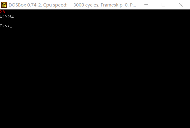对t2.asm进行汇编、连接后,得到可执行文件t2.exe。运行t2.exe,观察程序运行 结果,验证是否在屏幕左上方出现红色的数值36。 注*)经测试,有些平台在 dosbox 下运行这个程序时有些问题,如果屏幕左上方没有 输出结果,请运行程序t2.exe前,先输入cls命令清空一下屏幕,然后再执行t2.exe。