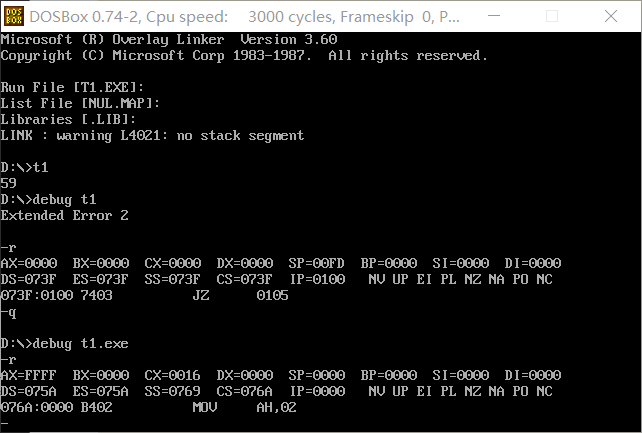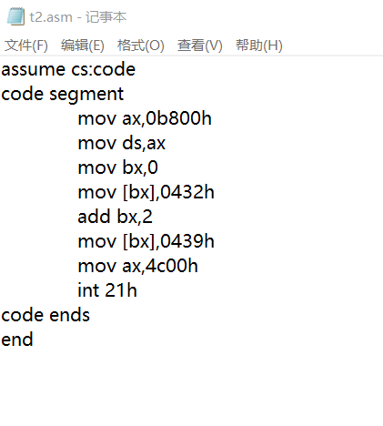 重新打开t2.asm,尝试将源代码中line7的0433h→0432h, line10 的0436h→0439h, 然后重新汇编、连接,得到可执行文件 t2.exe。使用cls命令清屏后,再次观察程序运行结果。