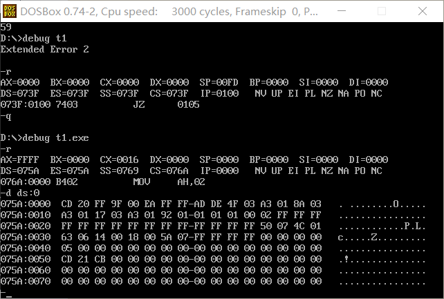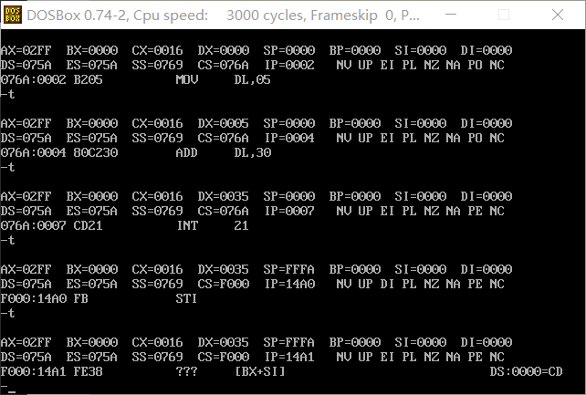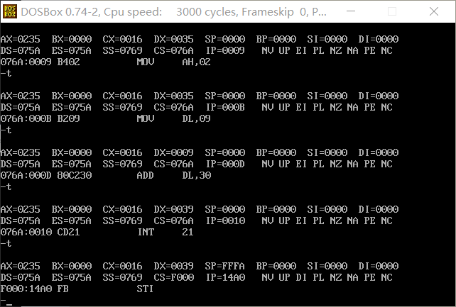 5.使用 t 命令和 p 命令(遇到 int 命令时,用 p 命令)单步调试,观察结果。