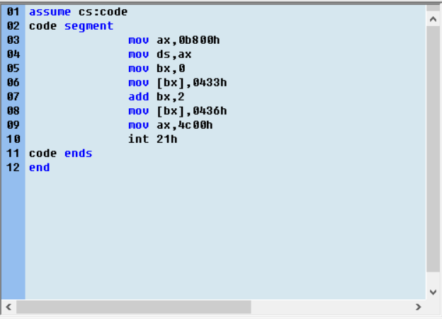 尝试将源代码中line7的0433h→0333h, line10 的 0436h→0336h, 然后重新汇编、连接,得到可执行文件 t2.exe。使用 cls 命令清 屏后,再次观察程序运行结果。