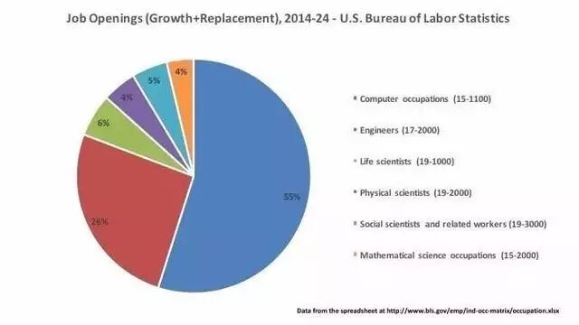 据美国劳动局数据,2014-2024年,STEM类工作的岗位增长率和开放率都是最高的。