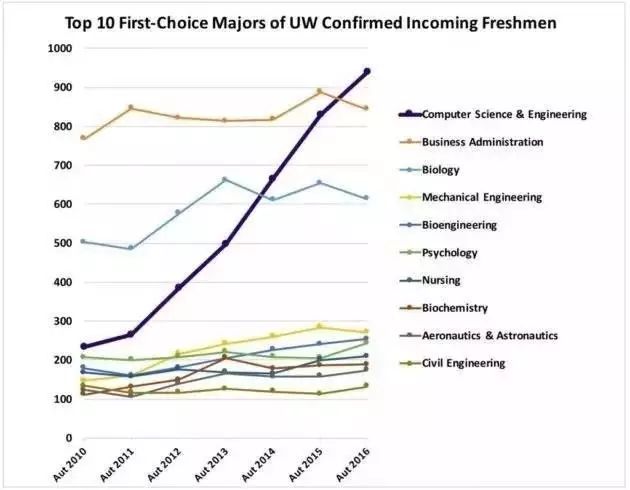 从图里可以看出来,在华盛顿大学,计算机科学和工程专业从2010年开始报考人数直线上升,到今年已经大幅超过一直处于领先地位的商科专业,成为本科生的首选专业。