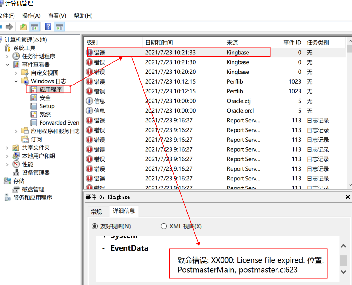 我的电脑--右键管理--事件查看器--Windows日志 找到对应Kingbase看报错是否为license
