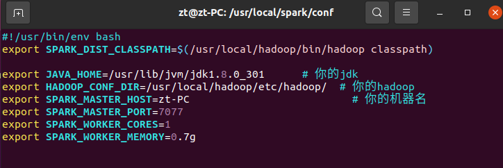 编辑该配置文件/usr/local/spark/conf/spark-env.sh,在文件中加上如下一行内容: