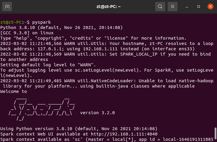 启动pyspark,成功后在输出信息的末尾可以看到“>>>”的命令提示符