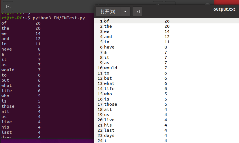 for i in range(len(items)): word, count = items[i] print("{0:<10}{1:>5}".format(word, count)) # 格式化输出词频统计结果 open('output.txt', 'a').write(word+"\t\t\t"+str(count)+"\n") # 写入output.txt中
