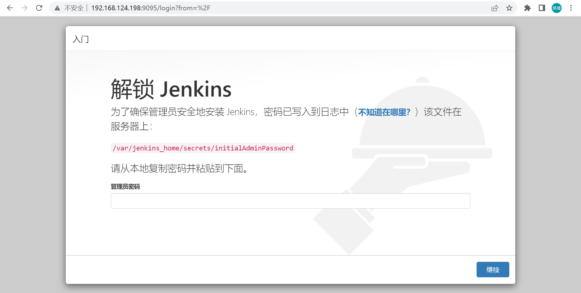这里要求输入初始的管理员密码,根据提示密码在/var/jenkins_home/secrets/initialAdminPassword这个文件中,注意这个路径是Docker容器中的,所以我们通过如下命令获取一下