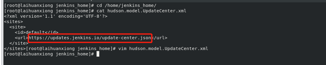 因为网络原因,需要将插件源设置为国内的,这样才可以安装插件。进入宿主机目录 /home/jenkins_home/,编辑文件 hudson.model.UpdateCenter.xml
