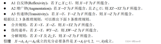 函数依赖的公理系统(Armstrong公理系统)。设关系模式R(U,F)中,U为属性集,F是U上的一组函数依赖,那么有以下的推理规则: