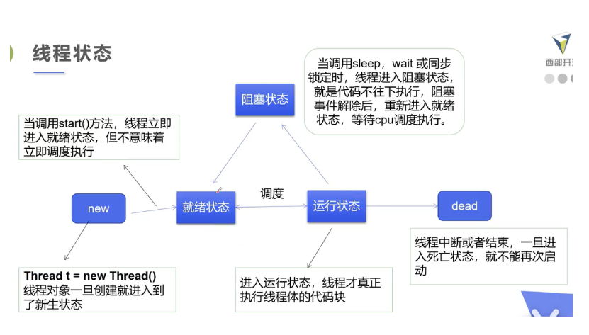 - 在一个进程中,如果开辟了多个线程,线程的运行有调度器安排调度,调度器是与操作系统紧密相关的额,先后顺序是不能人为干预的;