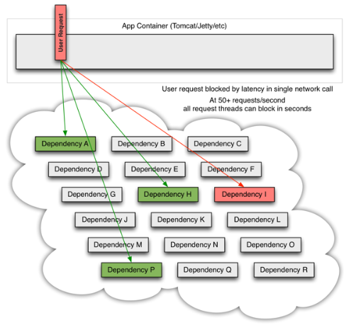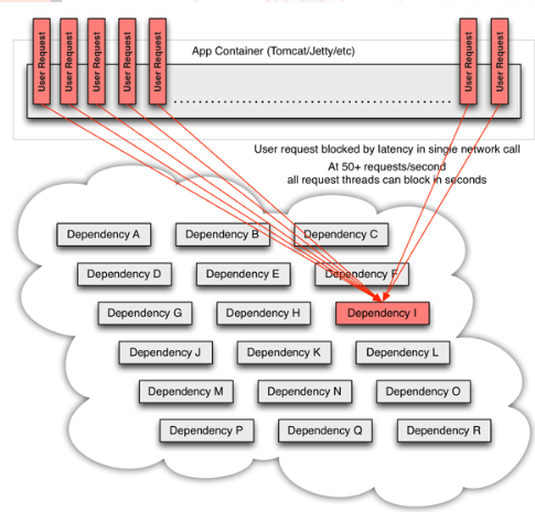 对于高流量的应用来说,单一的后端依赖可能会导致所有服务器上的所有资源都在几十秒内饱和。比失败更糟糕的是,这些应用程序还可能导致服务之间的延迟增加,备份队列,线程和其他系统资源紧张,导致整个系统发生更多的级联故障,这些都表示需要对故障和延迟进行隔离和管理,以达到单个依赖关系的失败而不影响整个应用程序或系统运行。
