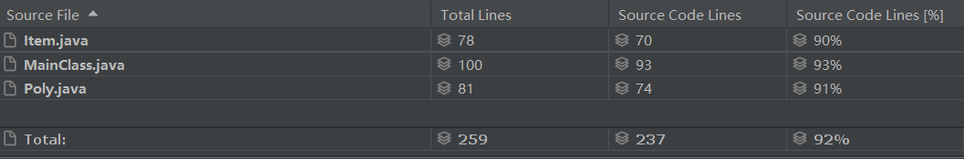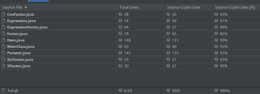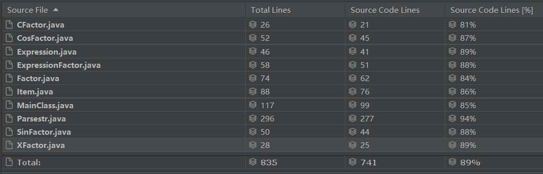上图是本次作业的复杂度和代码行数,可以看到主类不管是复杂度还是代码行数都是最多的,因为在这次作业中,我把所有对输入的处理全部放在了主类当中,表达式类和项类的主要方法只有求导和toString(),一开始去空格,消除多个加减号,还用了个大正则来拆出各个因子全部都在主类中,导致其复杂度过高。本次代码最大的缺点就是主类包含了太多的功能,应该将这些功能独立成一个或多个其他类来执行。