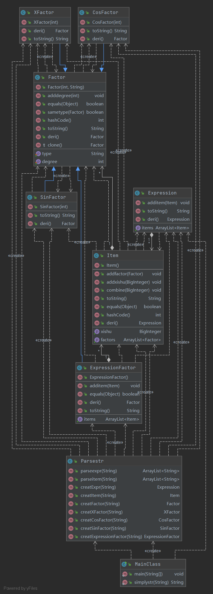 这一次我将第一次作业中主类的拆解表达式部分独立出来,形成了Parsestr类,在这个类中完成了对表达式的拆解,由于这次不只是幂函数,我无法通过正则表达式直接提取出各个因子,又由于表达式因子的出现,不能像第一次作业一样直接分割+-号来得到各个项,我采用了两个指针扫描表达式的方法来分解项和表达式,但是这就在for循环中使用多个if语句,导致了分解项和表达式的复杂度较高,这个类中creatFactor方法由于要判断是哪种因子,并且由于这次没有合法性检测,我直接将表达式因子放在了if语句中的else语句块中,并对表达式因子进行部分优化,导致它判断循环多重嵌套。而在项类中,由于我做了部分项的优化,在equal函数中用了多个循环和判断,让它的复杂度暴涨。