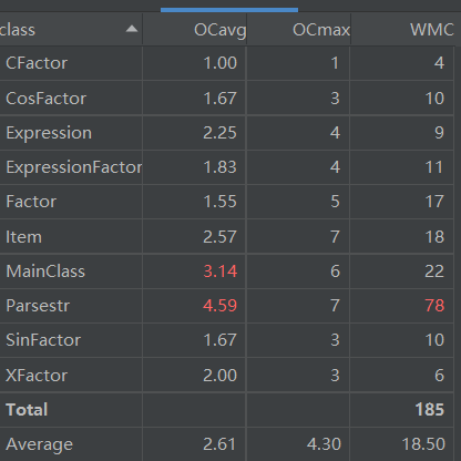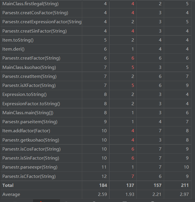 第三次作业我基本上放弃了优化,所以在第二次作业中那几个复杂度超高的方法都消失了,但是这次作业的合法性判断我是通过很多个特判来做到的,我直接在主类中特判了不能出现空格的地方和+-号的合法性,在无数个特判后终于做到像前两次作业中一样,直接消去空格和多余+-号,这些特判也让主类复杂度极高,而在分解表达式的类中,我也用各个因子的特判来验证合法性,所以这次代码复杂度都在合法性验证的特判上了。