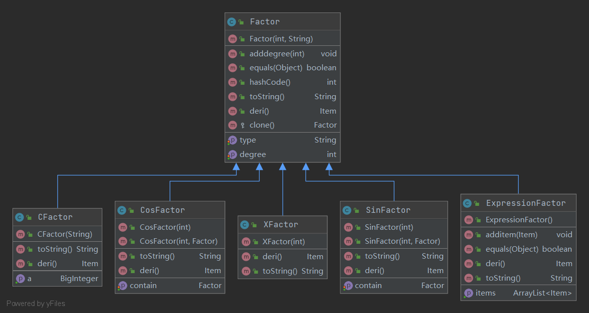 第二次作业的难度和第一次作业完全不是一个级别的,第二次作业新增加了sin,cos两个三角函数因子,并且增加了表达式因子,虽然这次作业难度极大,但是却让我感觉自己有了一点点的面向对象的思想,对于每个因子,建立了对应的因子类,它们通过继承同一个Factor类来进行管理,这次作业我的类层次分明,一个表达式类,以一个容器包含了多个项类,每个项类又用容器包含多个因子类,如果因子为表达式因子则重复上述结构,但是这次作业我没有建立常数类,我将常数类放在了项类中当作系数,这让我的程序多了一些对于不含任何因子的项的特判。
