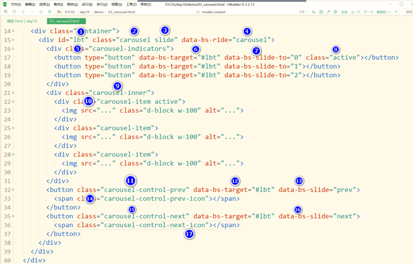 内部的小符号用什么标签都可以, data-bs-target="#lbt" 关联轮播图的id属性值,用来控 制轮播图切换图片的功能 data-bs-slide-to="数字" 数字和图片数量的长度有关,对应的应该是图片的数组索引,从0 位开始。